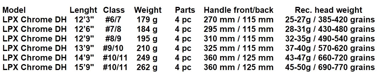 The LPX Chrome rods has custom designed reel seat and FLOR grade quality cork grips with rubber-cork reinforcements to stand the test of time and hard days on the water. The actions are adjusted for each model and length, to ensure you get the best casting and fishing tool available for a given fishing situation. For the models in 12’3″, 12’6” and 12’9″ lengths, we recommend our compact 3D+ shooting head series or the 4D Compact Body and Tip concept. Rods from 13’9″ to 15’9″ will perform superb with the original 4D- and 3D+ shooting heads.